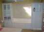 White with flutes, rosettes, matching backs, mullion doors with glass inserts & custom base molding