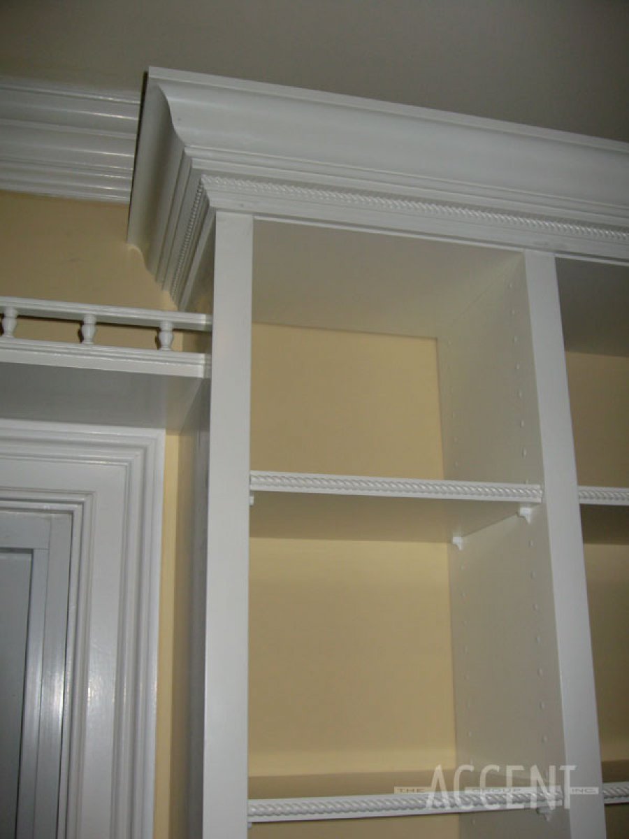 Gloss white with mitered doors, custom base, rope crown, & galley rail